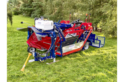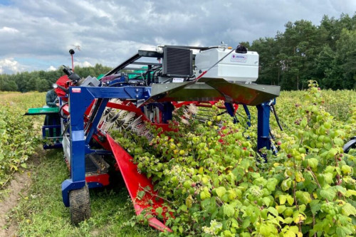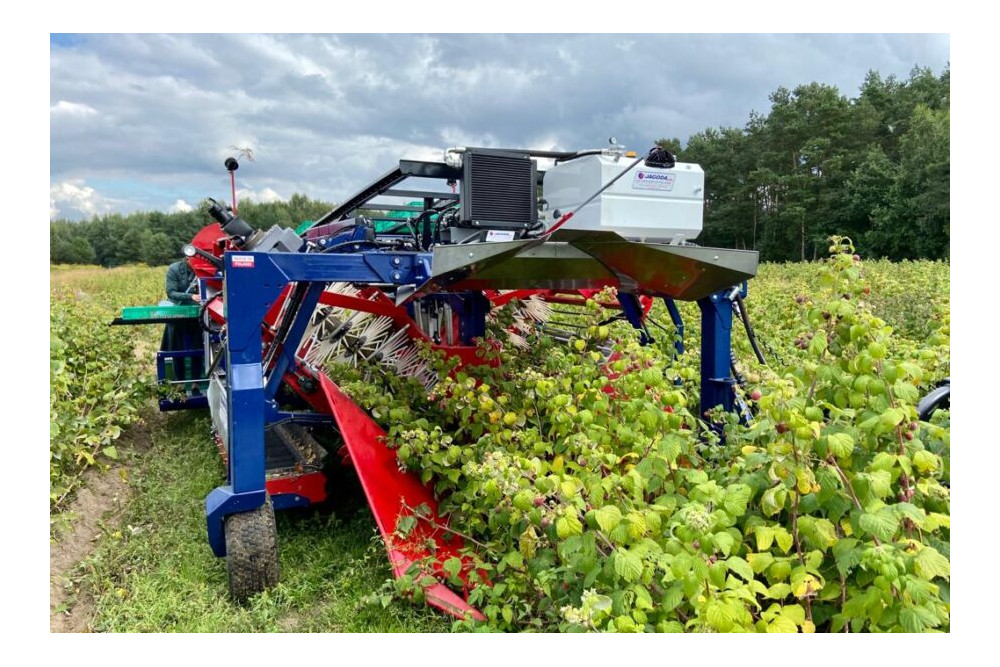 - Asymetryczne położenie otrząsaczy (otrząsacz lewy jest przesunięty w stosunku do prawego wzdłuż osi maszyny) oraz zastosowanie nowatorskiego systemu hydraulicznej regulacji kąta nachylenia otrząsaczy umożliwia dostosowywanie zespołu otrząsania do niskich i wysokich krzewów, a w konsekwencji zbiór różnych gatunków owoców jagodowych, w tym malin odmian owocujących na pędach jednorocznych
