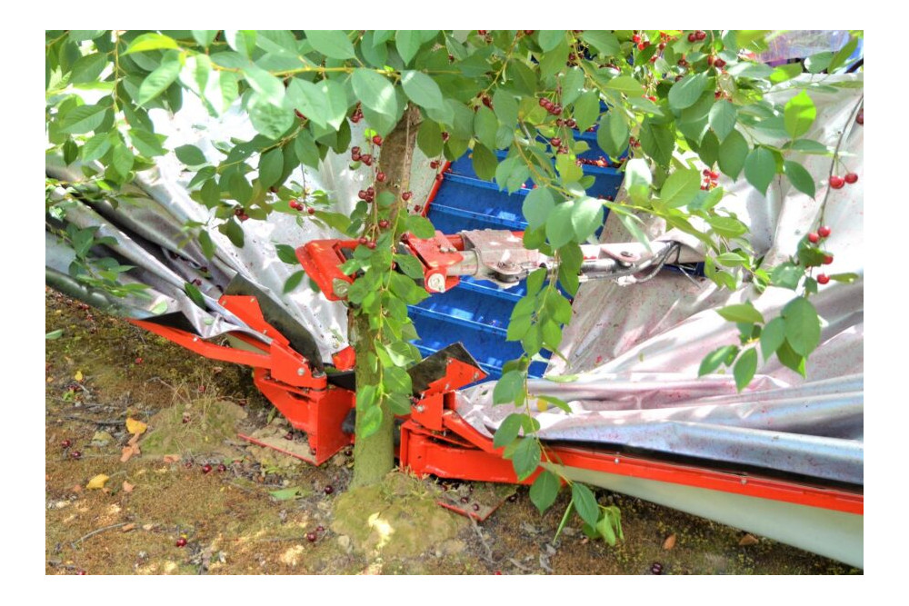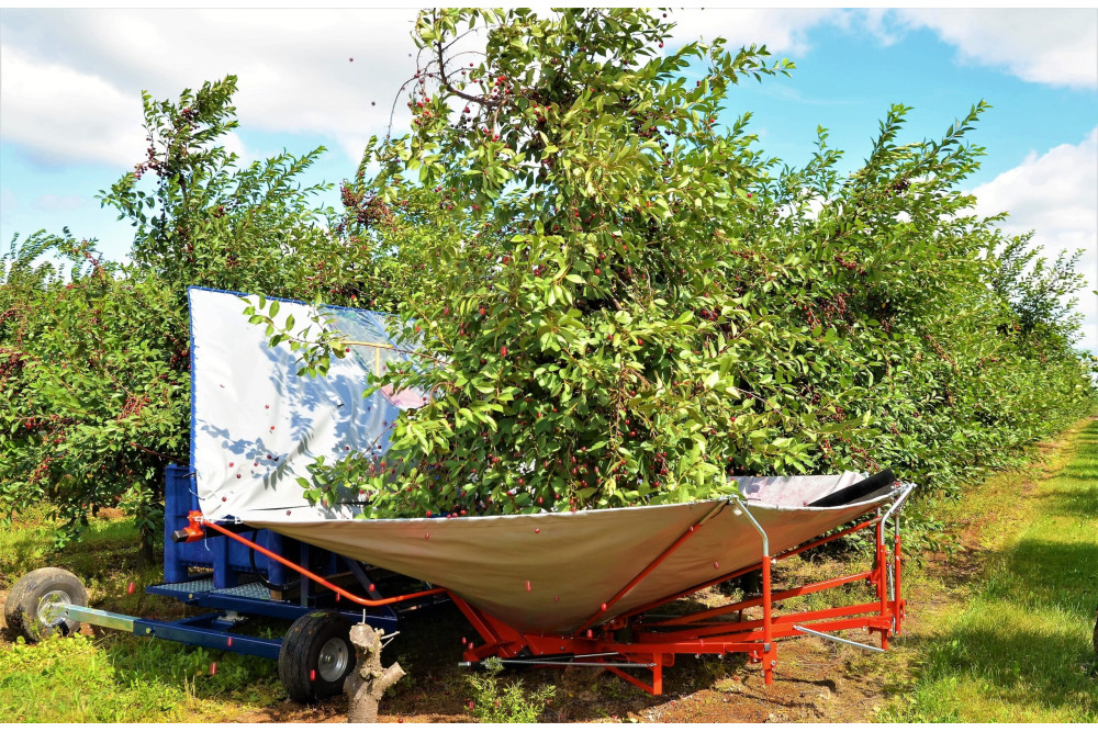 Zbiór wiśni GACEK przeznaczone jest do zbioru wiśni jak również innych owoców pestkowych np. śliwek (otrząsarka do śliwek). Zbiór następuje przez otrząsanie, następnie zostają usunięte zanieczyszczenia przy pomocy wentylatora i owoce zsypywane są do skrzynek lub skrzyniopalet.