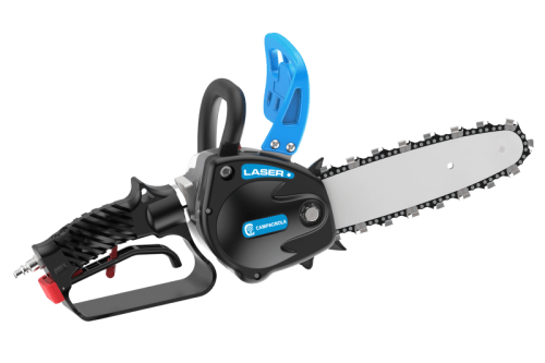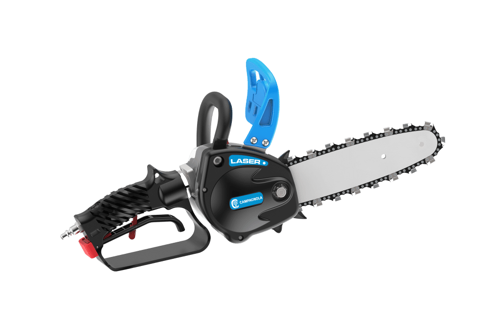 LASER jest niezwykle szybkim i wydajnym narzędziem pneumatycznym. Nie emituje hałasu, wibracji ani gazu wylotowego. Charakteryzuje się korpusem ze stopu magnezu, ergonomicznym uchwytem dłoni i osłoną dłoni z hamulcem łańcucha. Łańcuch jest automatycznie smarowany. Piła ta może ciąć gałęzie o średnicy do 20 cm i jest wyposażona w prowadnicę 8” lub 10”.